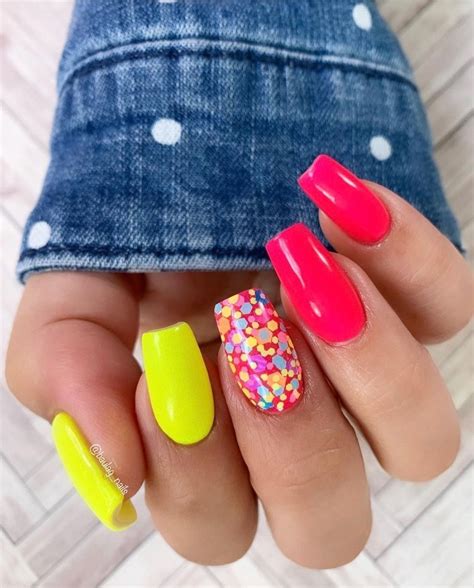 Let your nails scream "summer" with a burst of neon brights. These eye-popping hues, such as electric pink, blazing orange, and luminous yellow, will electrify your hands and add a touch of instant cheer. Paint each nail a different color for a playful mix and match effect, or create a chic accent nail by adding a touch of glitter or a contrasting color.