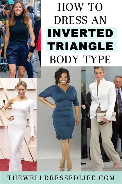 The inverted triangle body type has a wider shoulder than hips. To balance your figure, choose outfits that widen your lower body and narrow your upper body. A-line skirts, wide-leg pants, and tops with empire waists will help create a more proportional look. Avoid tops with shoulder pads or embellishments that can make your shoulders appear wider.